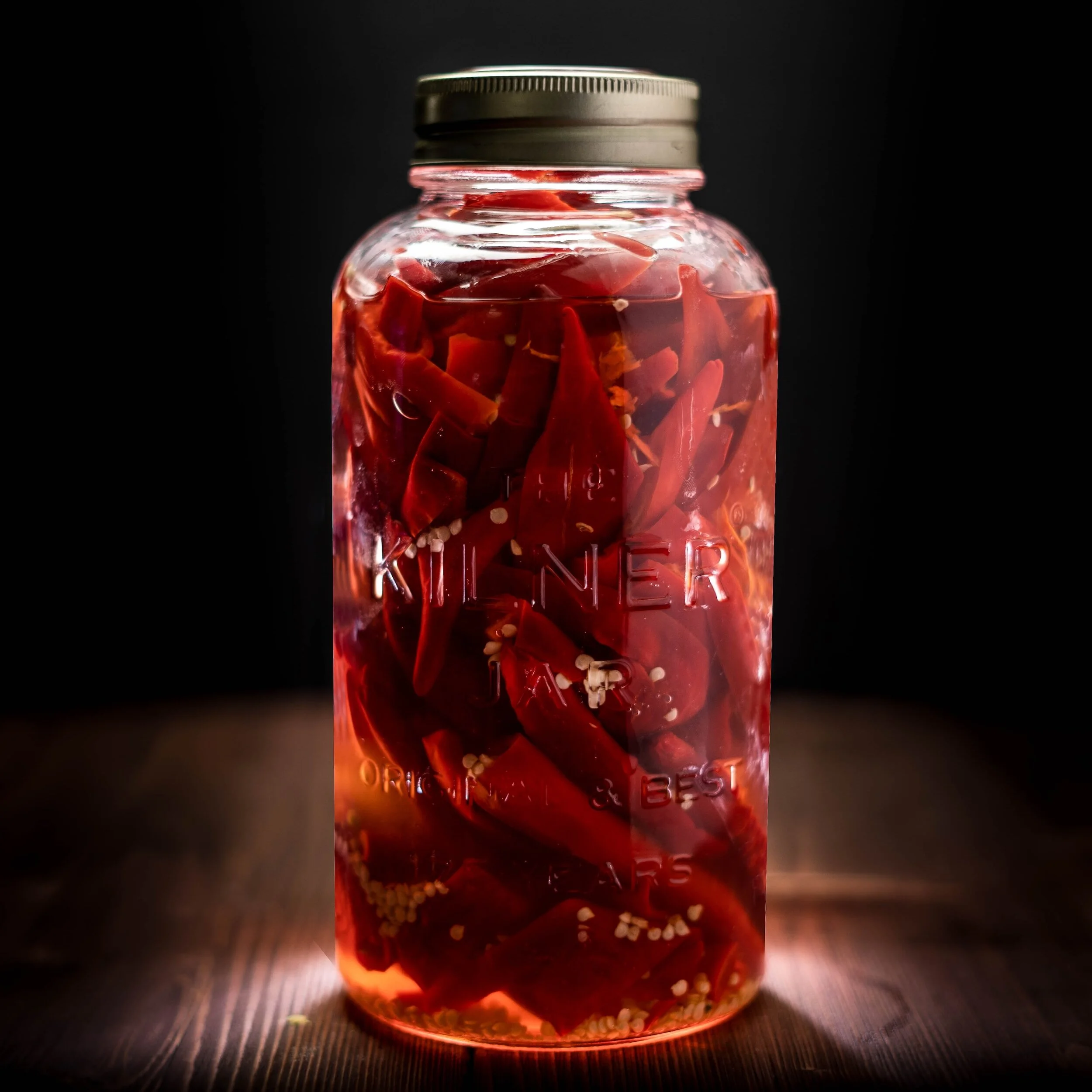 In a large mason jar (16 or 32-ounces), pack all of the peppers, carrots, and garlic inside.